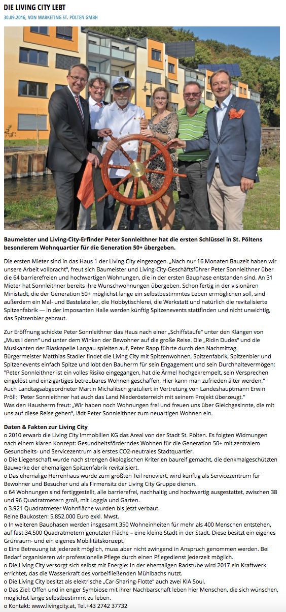 Eröffnungsfeier LIVING City Am 30. September 2016 fand die Eröffnung des ersten Wohnhauses (Wohnhaus 1) in der Living City - ehemalige Spitzenfabrik statt. St. Pölten Konkret - 30-09-2016 - Die Living City lebt! |